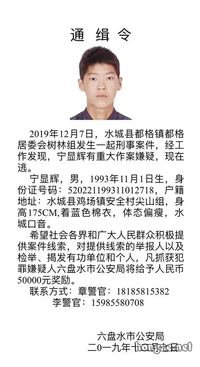 12月7日案发当天,六盘水警方就发布了通缉令,希望社会各界和广大人民群众积极提供案件线索,对提供线索的举报人以及检举、揭发有功单位和个人,凡抓获犯罪嫌疑人六盘水市公安局将给予人民币50000元!