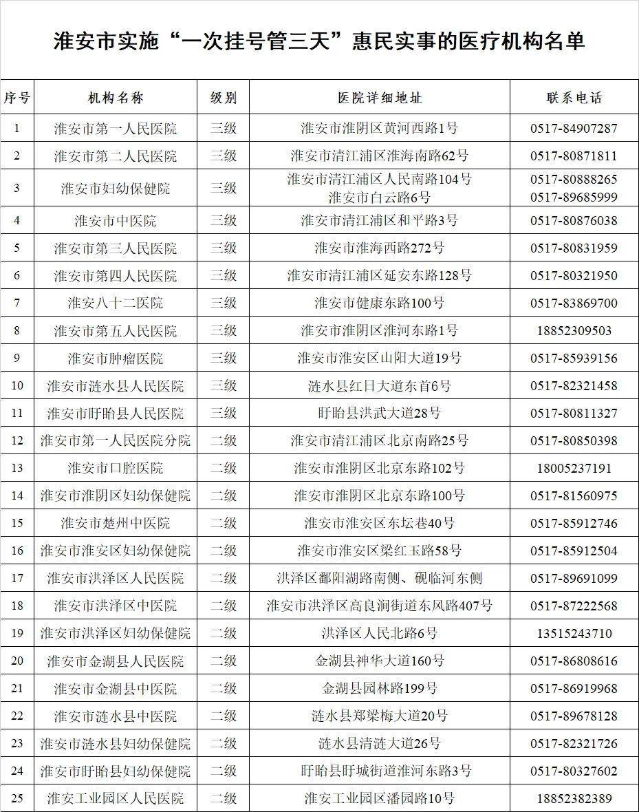 答:全省二级及以上公立医疗机构(包括中医医院、妇幼保健院、儿童医院等)均实行普通门诊“一次挂号管三天”。上述医疗机构名单可通过省、设区市、县(市、区)卫生健康委网站查询(省卫生健康委网址为https://wjw.jiangsu.gov.cn/)。