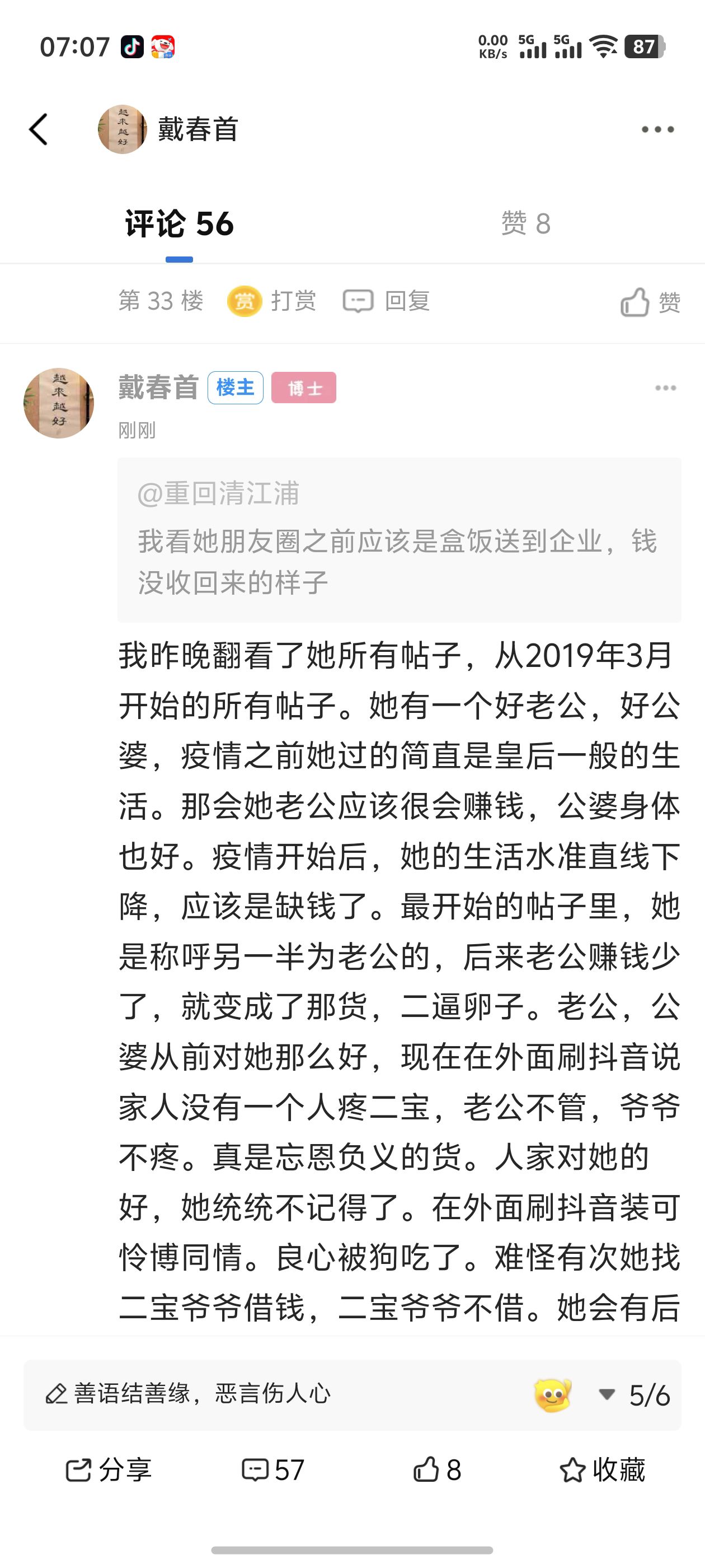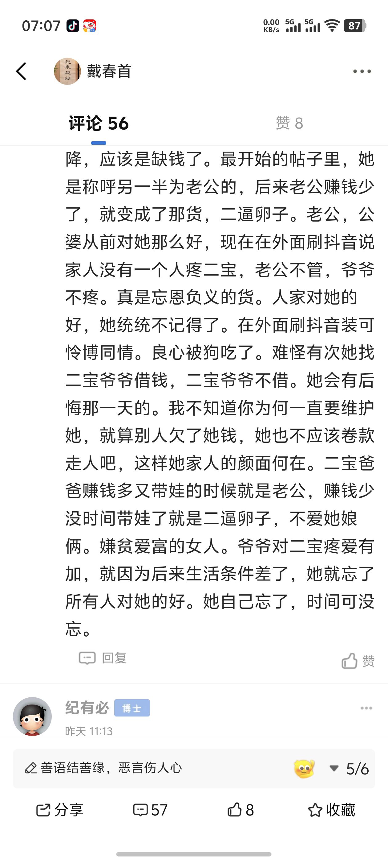 我昨晚翻看了她所有帖子,从2019年3月开始的所有帖子。她有一个好老公,好公婆,疫情之前她过的简直是皇后一般的生活。那会她老公应该很会赚钱,公婆身体也好。疫情开始后,她的生活水准直线下降,应该是缺钱了。最开始的帖子里,她是称呼另一半为老公的,后来老公赚钱少了,就变成了那货,二逼卵子。老公,公婆从前对她那么好,现在在外面刷抖音说家人没有一个人疼二宝,老公不管,爷爷不疼。真是忘恩负义的货。人家对她的好,她统统不记得了。在外面刷抖音装可怜博同情。良心被狗吃了。难怪有次她找二宝爷爷借钱,二宝爷爷不借。她会有后悔那一天的。我不知道你为何一直要维护她,就算别人欠了她钱,她也不应该卷款走人吧,这样她家人的颜面何在。二宝爸爸赚钱多又带娃的时候就是老公,赚钱少没时间带娃了就是二逼卵子,不爱她娘俩。嫌贫爱富的女人。爷爷对二宝疼爱有加,就因为后来生活条件差了,她就忘了所有人对她的好。她自己忘了,时间可没忘。