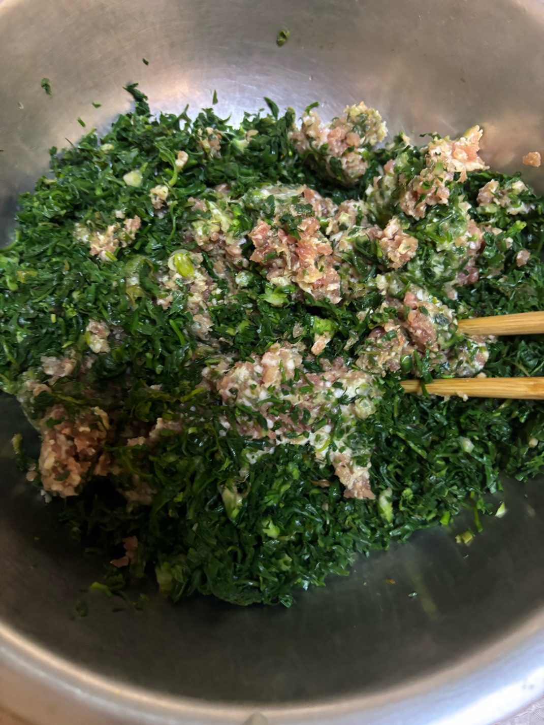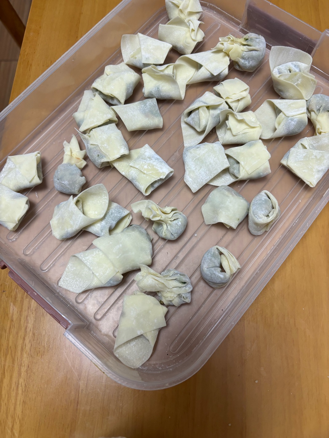 包点馄饨,不想用纯肉的,加点荠菜,包好了放冰箱,明天早晨拿出来煮一下就是,忽略形状哦,什么样式的都有