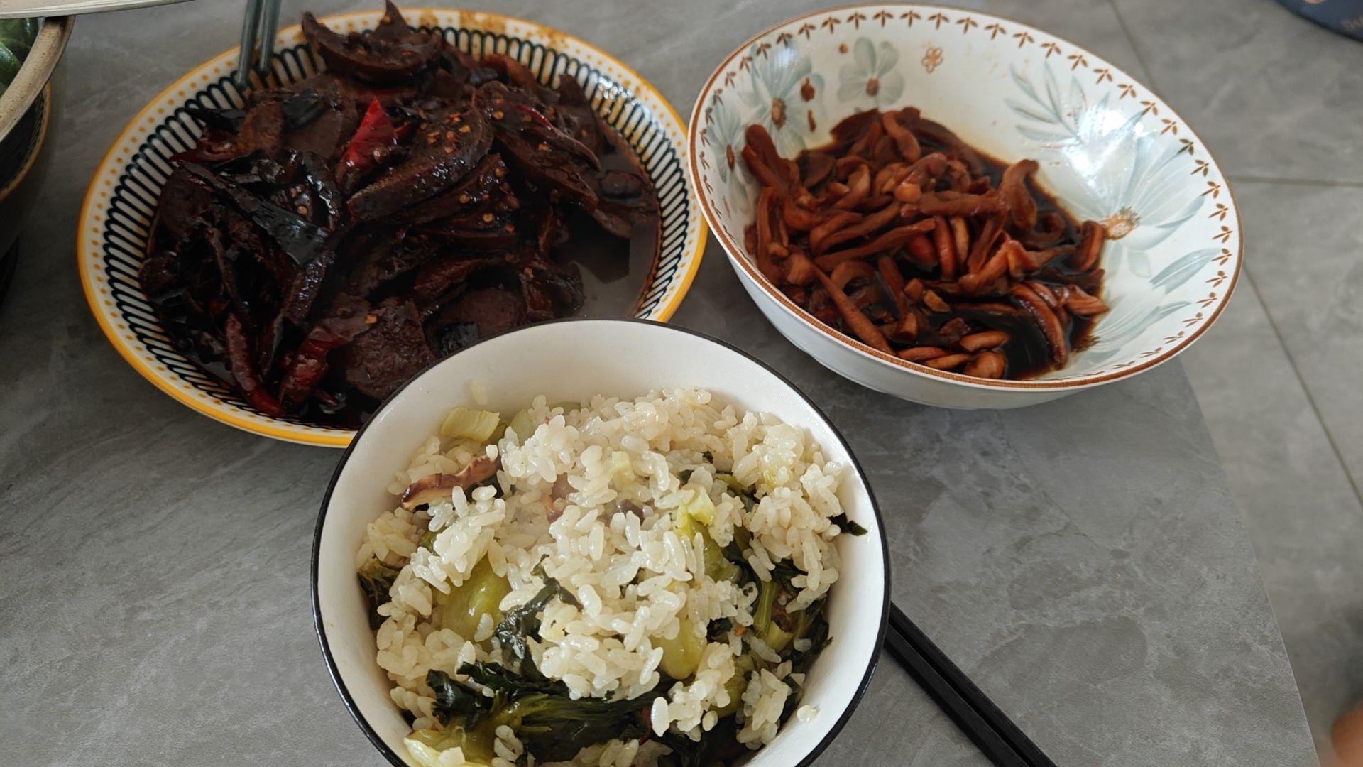 咸肉菜饭,萝卜干,香辣猪肝,菠菜汤,又要多干一碗饭