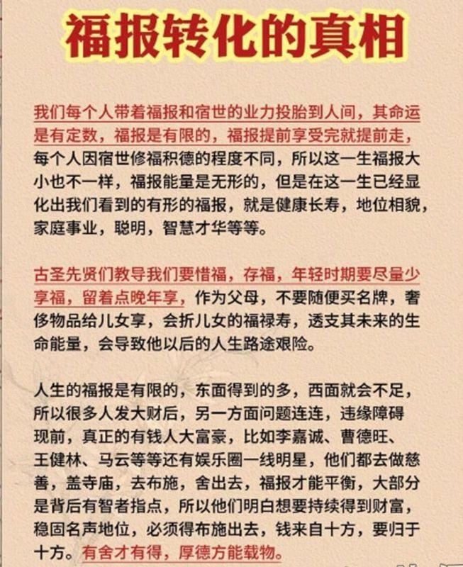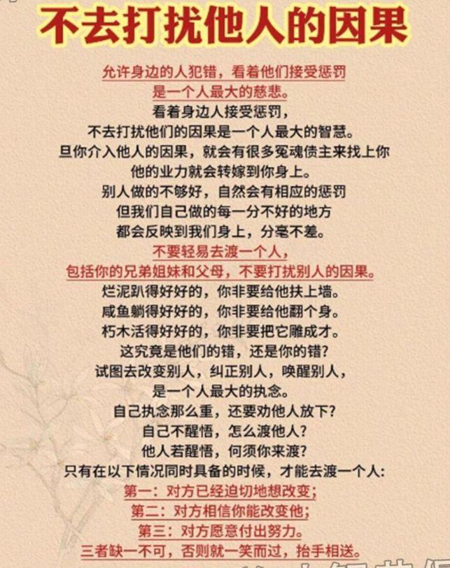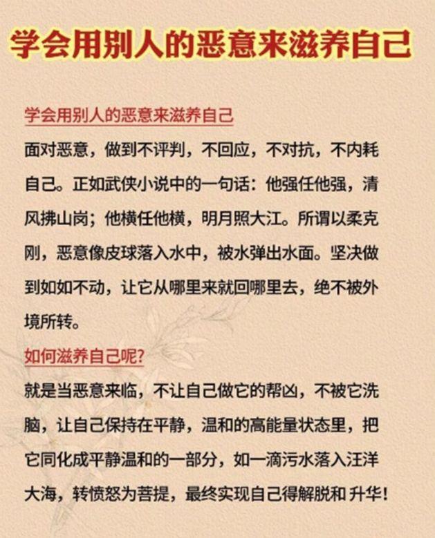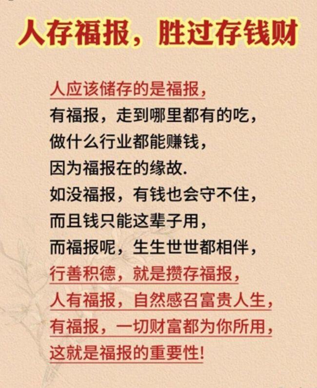 15.厚德才能载物,厚德才能托福。千金财富者必是千金之人物。平时就应该注重行善积德、乐善好施,和谐人际关系,可以积攒一定的人脉资源,人缘好很多事情就好办了。孟子曰:天时不如地利,地利不如人和。人脉圈里一定要有至亲好友,最好还有教师、医生、律师、公务员,甚至是大老板等等。你记住了:心术不正难富贵,狡诈之人必自毁;心机深沉难长久,虚伪之辈终自败;处世但求厚道行,上天自有公论在;为人但持善良心,真相终会为君言。