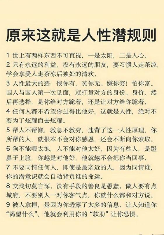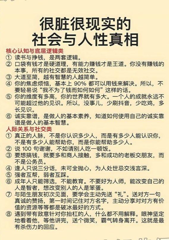 16.多跟富人混,少跟穷人混。跟富人混,多会越混越富;跟穷人混,只会越混越穷。 跟富人混多谈生意、多合作共赢,跟穷人混偶尔发发慈悲,多做些慈善,比如布施些余财~长期闲置物品等等。古人就讲:劳心者治人,劳力者治于人。没有通天手段,哪来家财万贯?永远记住:富在术多,不在劳身;利在局势,不在力耕。