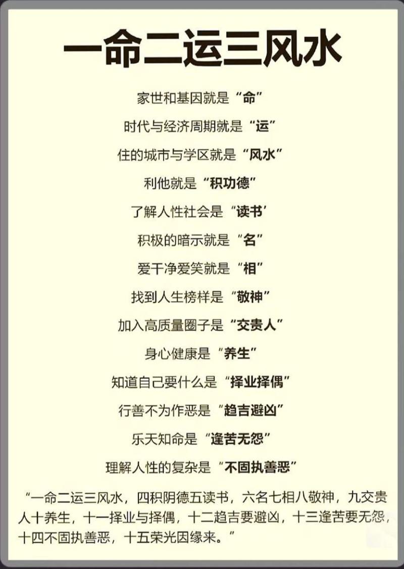 20.《了凡四训》(袁了凡/袁黄):世间(长期)享千金之产者,定是千金人物;享百金之产者,定是百金人物;应饿死者,定是饿死人物。天不过因材而笃,几曾加纤毫意思。谋事在人,成事在天;尽人事,听天命。命里有时终须有,命里无时莫强求。社会资源永远有限,每个人的时间、精力和能力都很有限,不可能所有人都能够出人头地、大富大贵,小农思想~小富即安、中产阶级也是一种幸福。家藏亿贯不骄横,人无祸疾才幸福。日不总当顶,家无万世富。三分天注定,七分靠打拼,爱拼才会赢。一定要明白,若人已经全力以赴了但仍然不能出人头地,那就认命吧。要知道大富大贵的背后就是大灾大难,当灾难来了,自身有没有那个实力扛得住,将灾难摆平呢?
