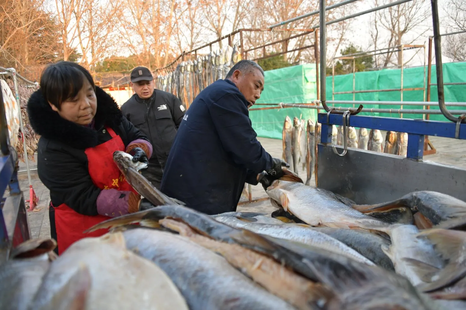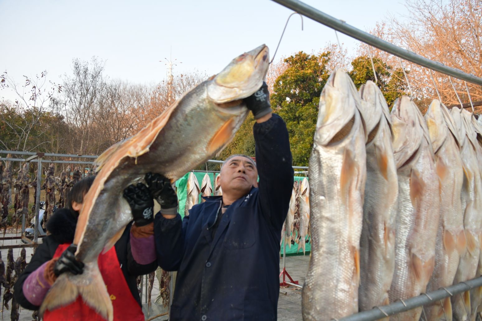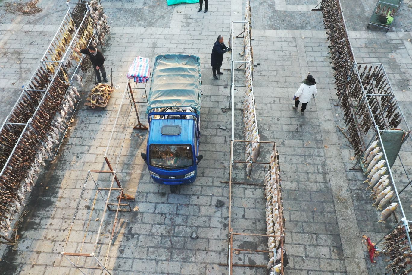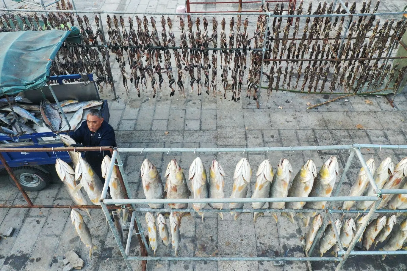 2025年12月28日,淮安市洪泽区高良涧街道,洪泽湖古渔市市场商户正在晾晒咸鱼等订单咸货,每天通过线上线下渠道销售到各地。随着2026年新年将至,当地商户纷纷腌制咸鱼、咸鹅等特色咸货产品提前备足年货。