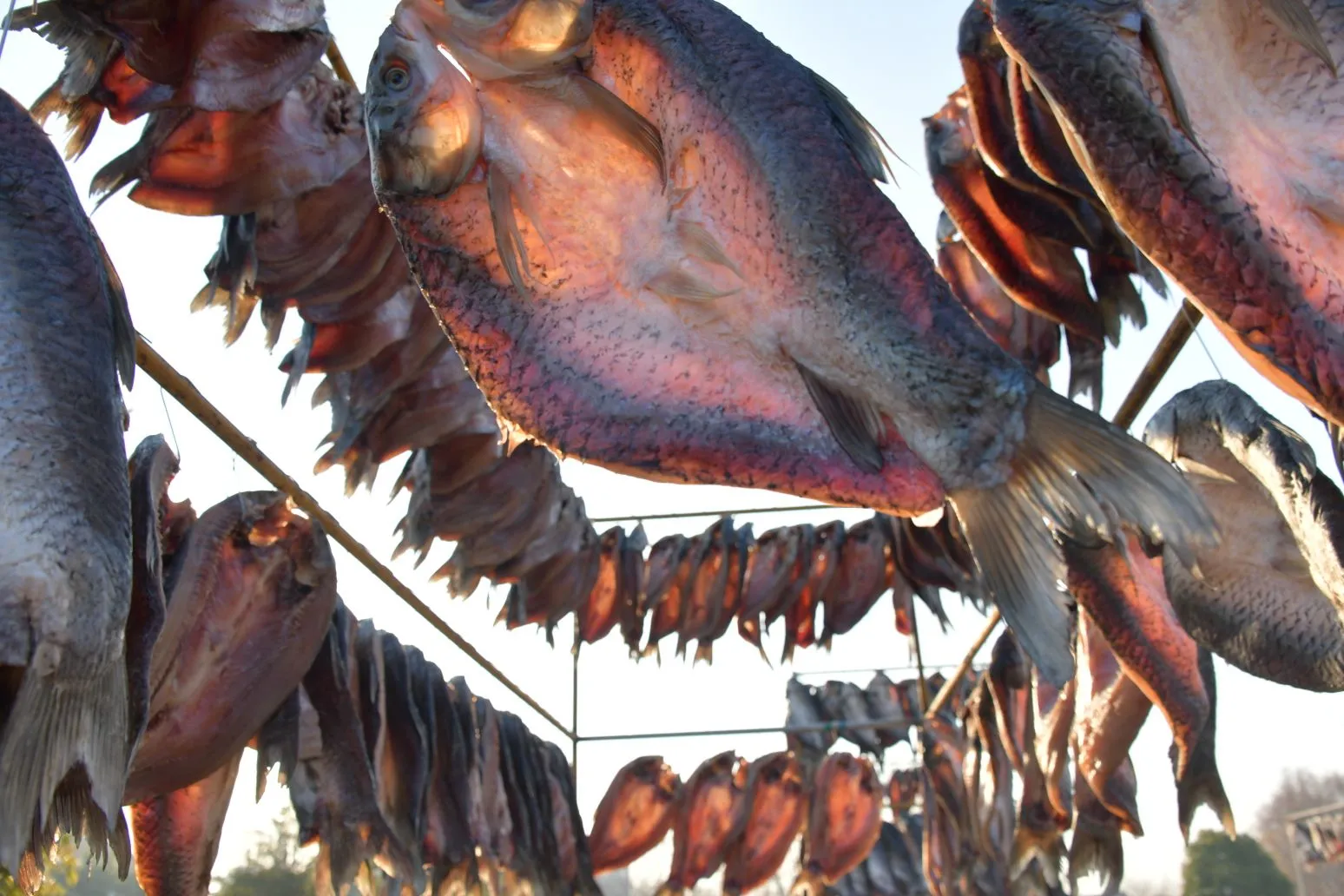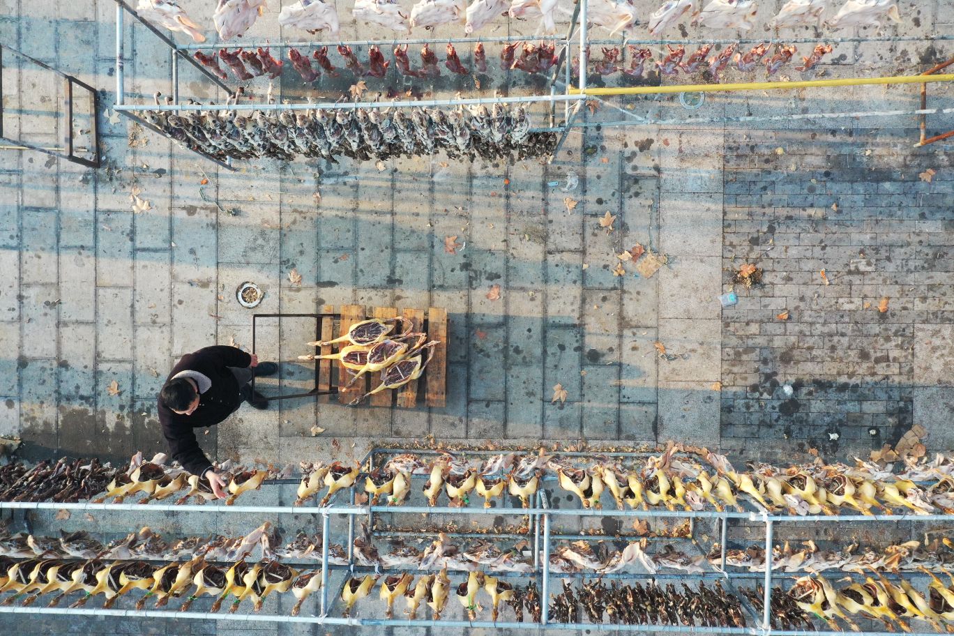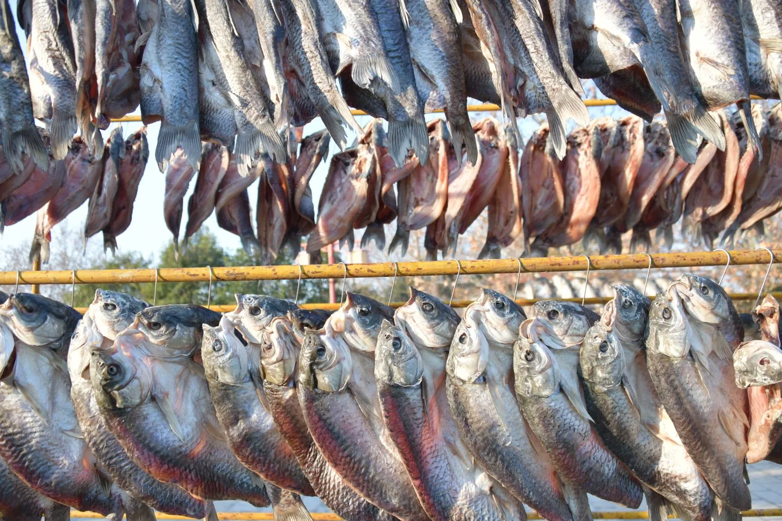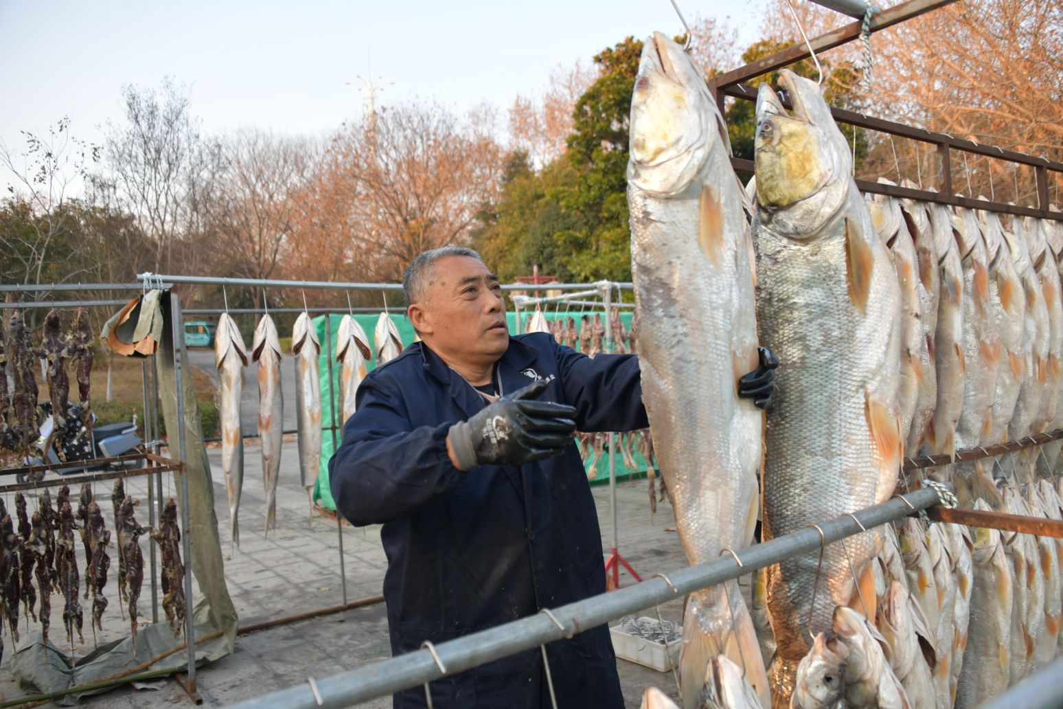 2025年12月28日,淮安市洪泽区高良涧街道,洪泽湖古渔市市场商户正在晾晒咸鱼等订单咸货,每天通过线上线下渠道销售到各地。随着2026年新年将至,当地商户纷纷腌制咸鱼、咸鹅等特色咸货产品提前备足年货。