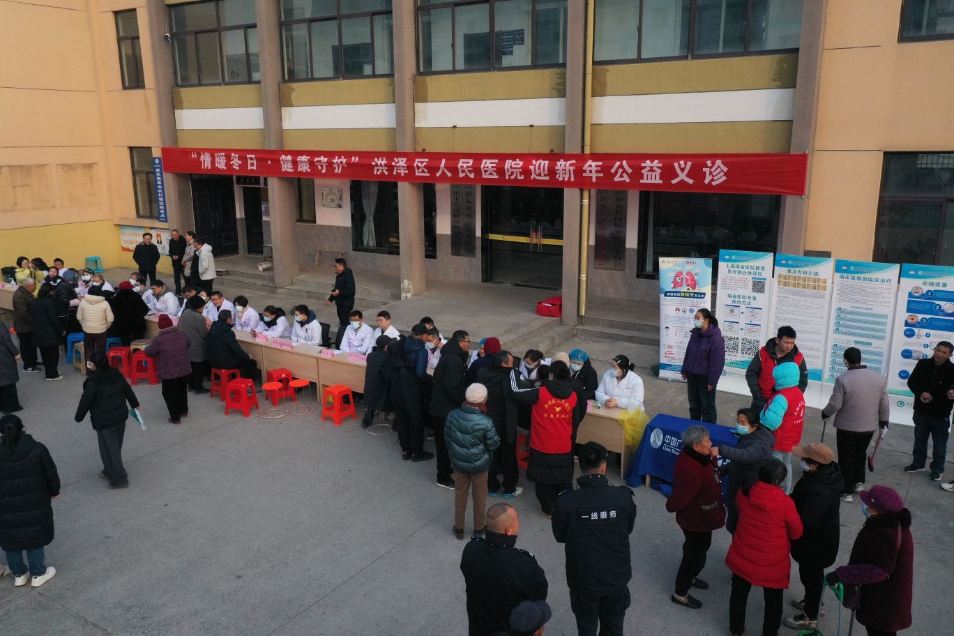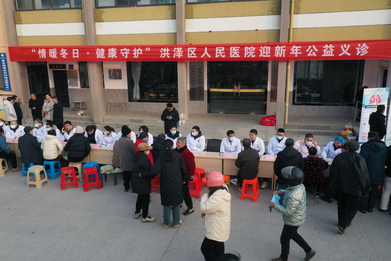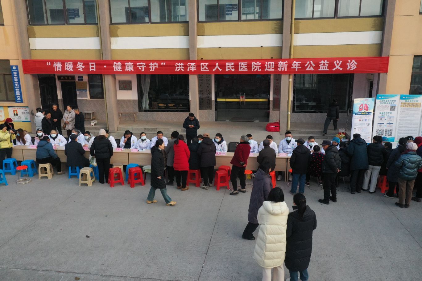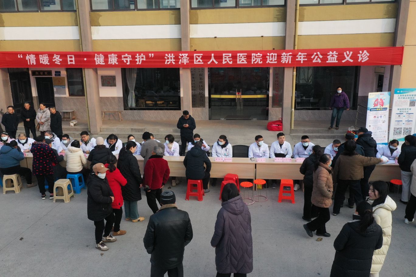 2025年12月31日,淮安市洪泽区人民医院“情暖冬日.健康守护”迎新年公益义诊活动走进高良涧街道崔朱社区党群服务中心门前广场,把优质的医疗资源送到居民群众身边。活动现场,洪泽区人民医院的25个临床医技科室骨干医务人员为居民提供免费疾病问诊、体格检查、病情分析、健康知识及个性化诊疗服务。