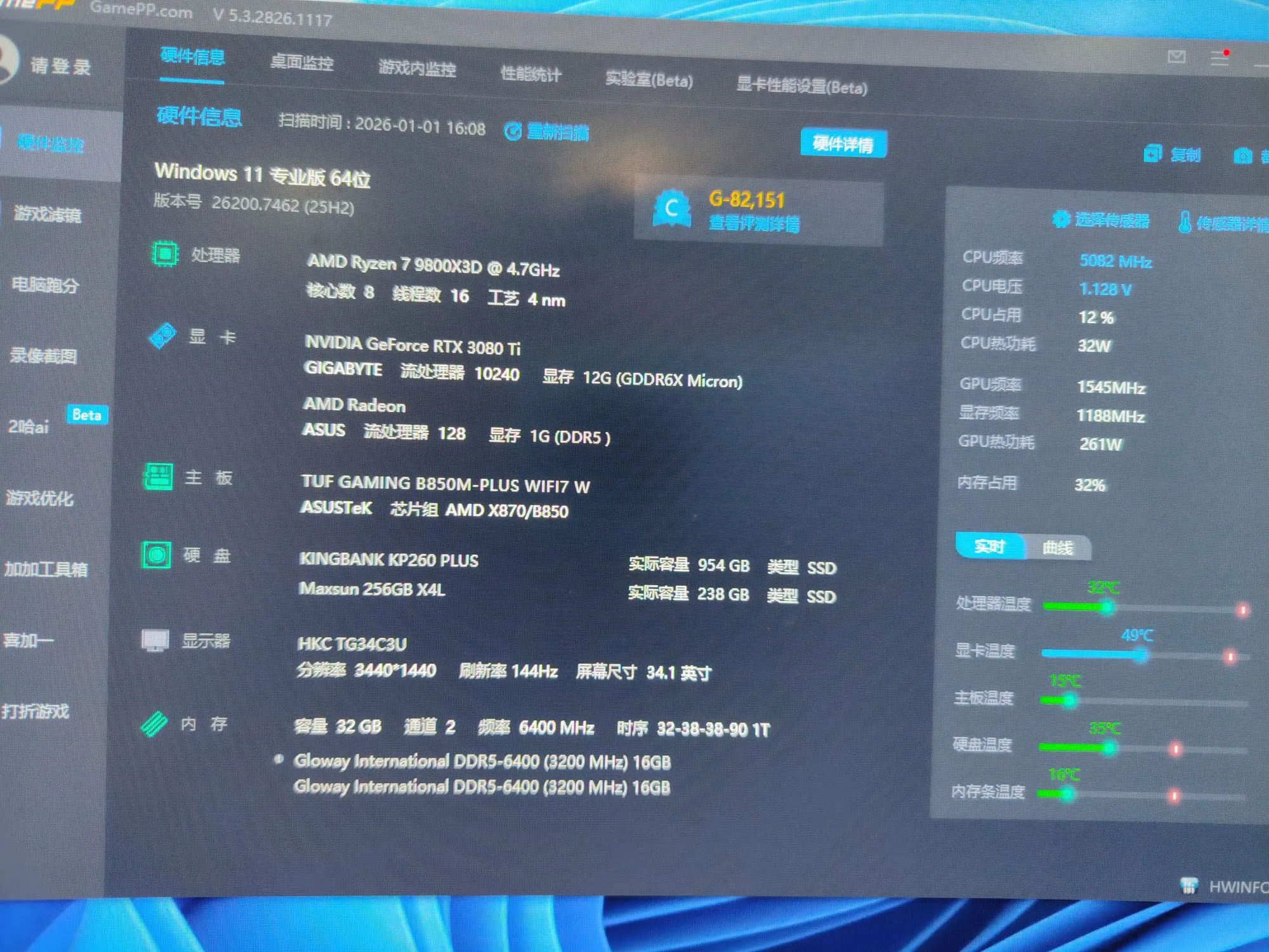 ① 预付定金均存在欺骗行为! 【出】自用主机一套,配置高,性能强劲,AMD R9 9800x3d,RTX 3080 Ti 12g显存,32G DDR5 6400内存,主板TUF GAMING B850M-PLUS WIFI7,华硕芯片组,SSD 1tm2+256Gssd,利民360水冷 三块利民积木风扇灯效好看,显示器HKC TG34C3U,34.1寸,144Hz高刷,打游戏、剪辑、办公都没问题。cpu温度很低 基本五十度成色还可以,功能全正常,没修过,县城可自提,细节私聊~ 更多信息 | |