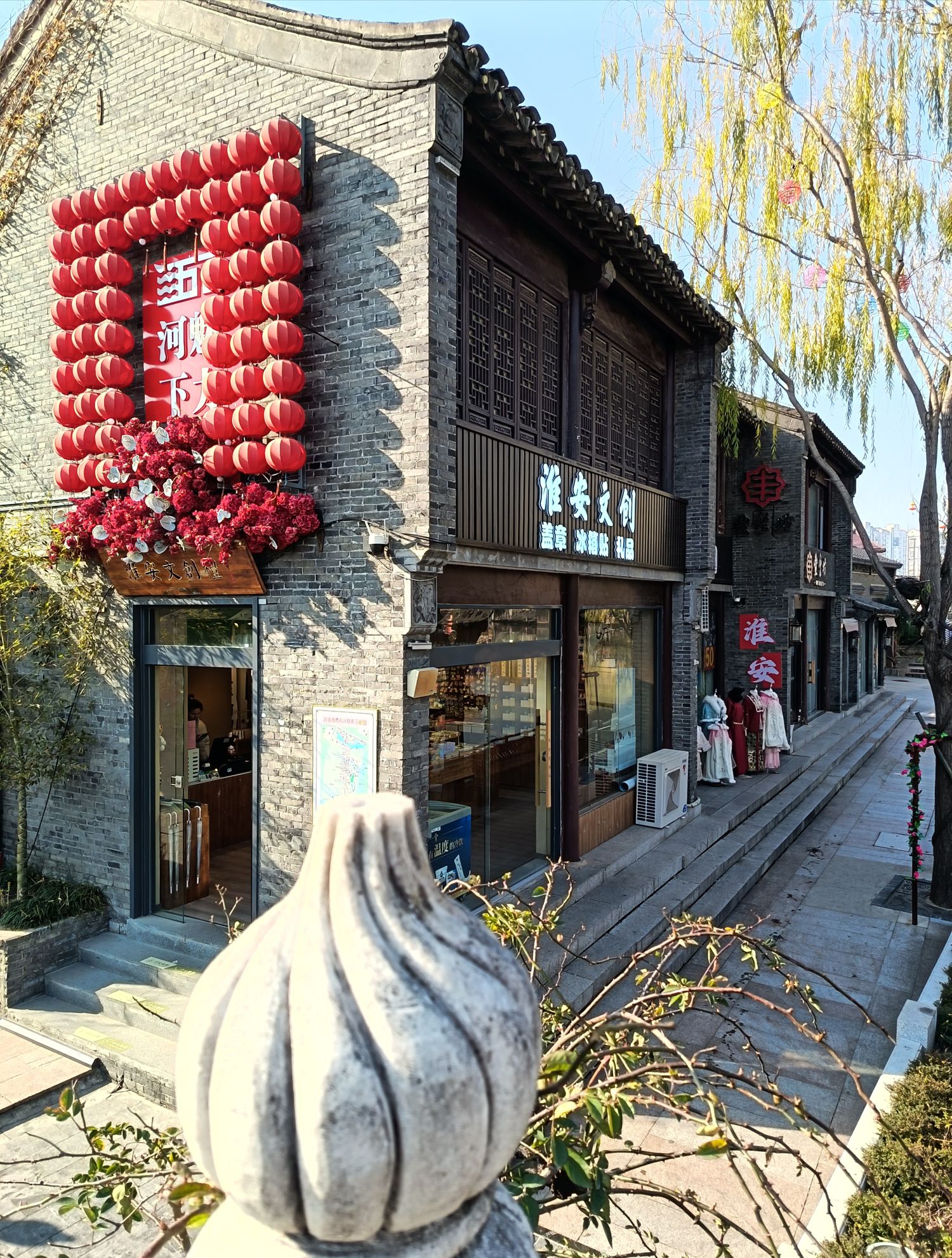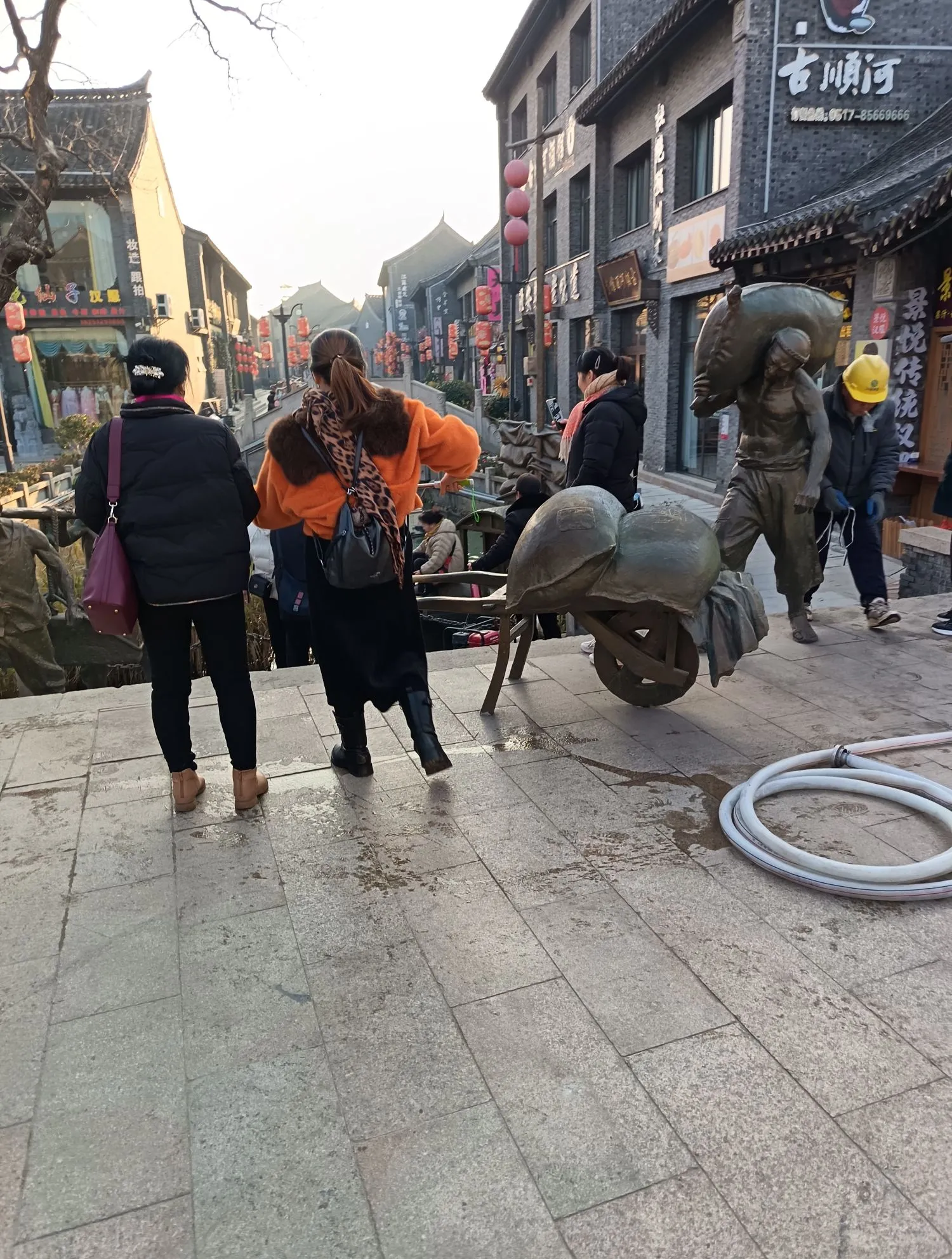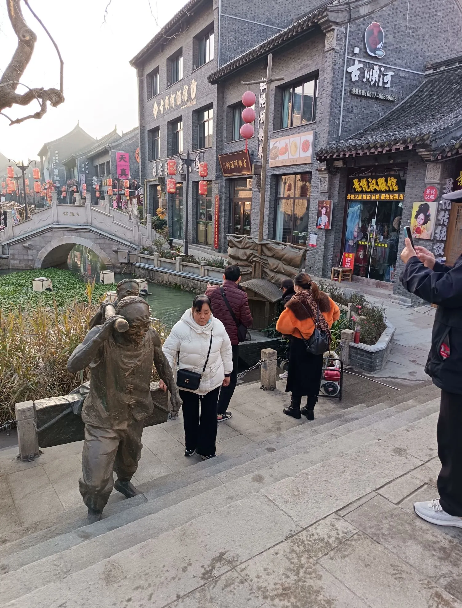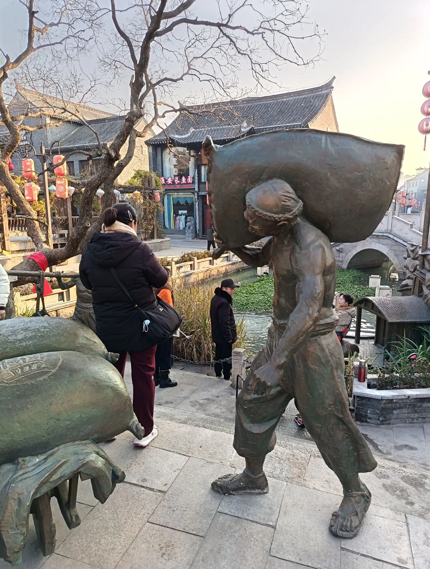 在淮安河下古镇,石板老街延长数里,小桥流水,古色古香,塑雕带着古韵,引人夺目,拍照留念。