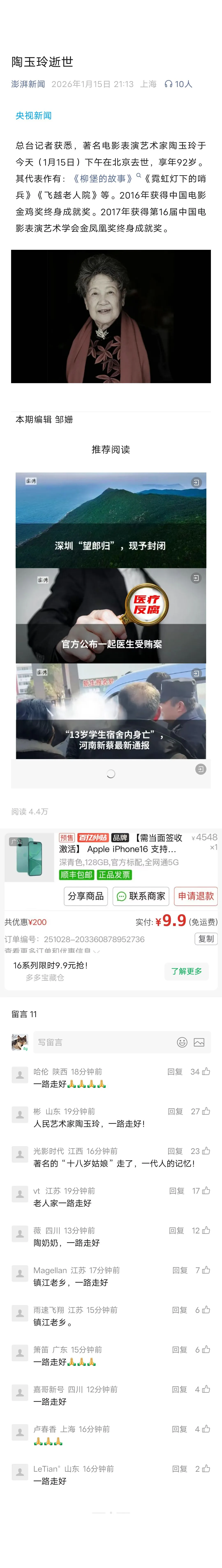 昨晚是国棋聶卫平去世,今天老艺术家陶玉铃也去世了!