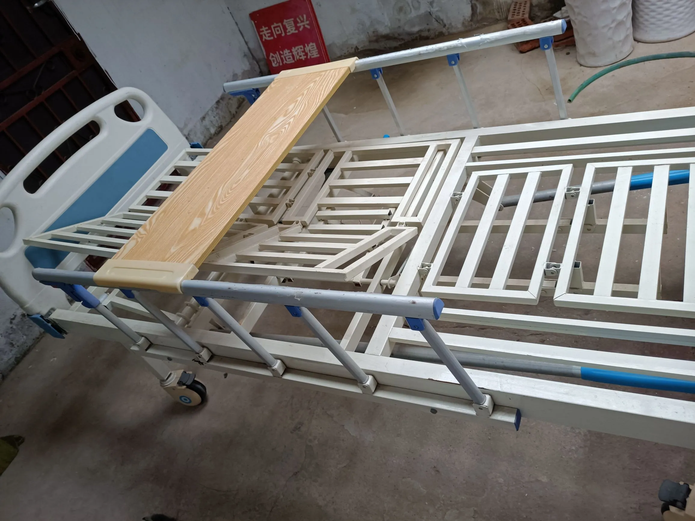 九五成新医疗床,有三面摇把,侧翻,床头,床尾起落,配件见图。 更多信息