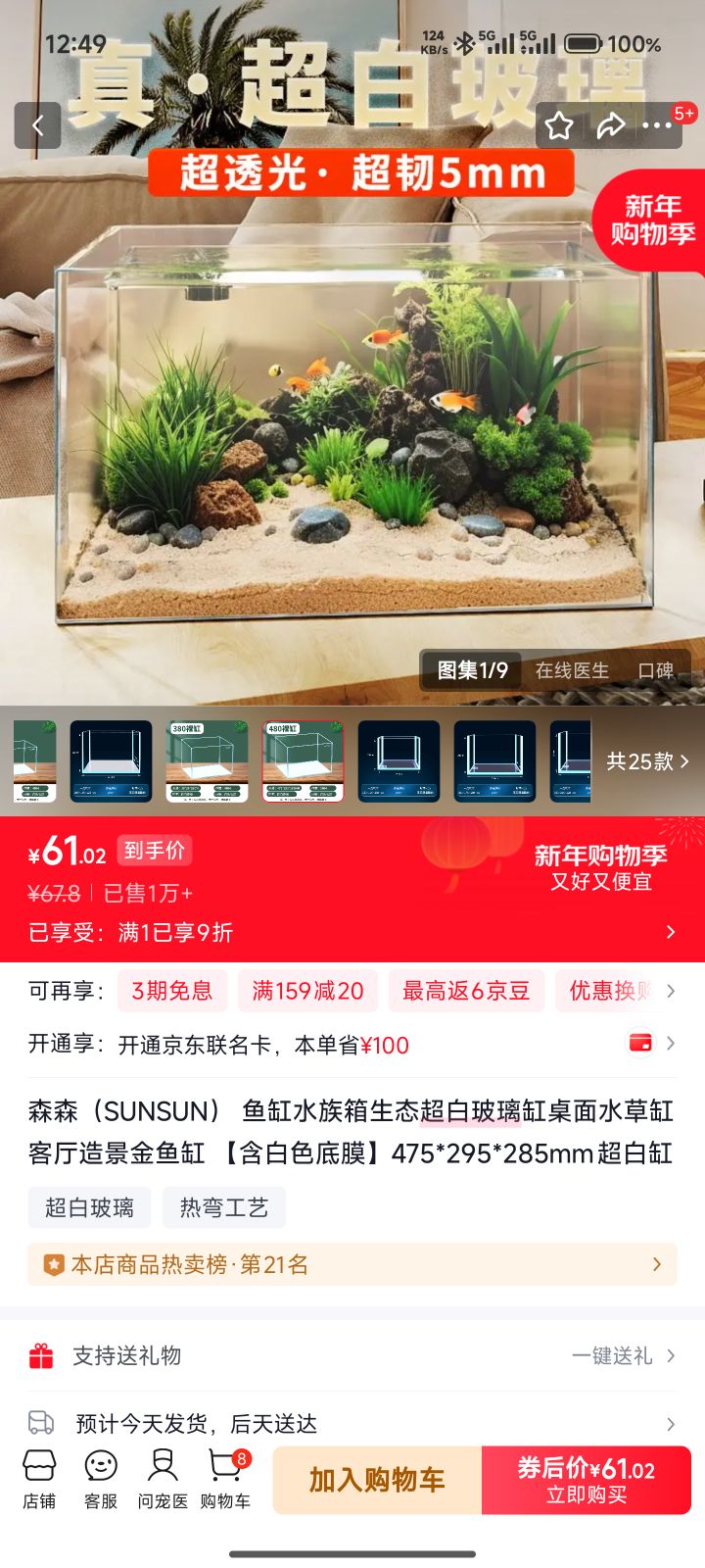全新森森鱼缸,森森(SUNSUN) 鱼缸水族箱生态超白玻璃缸桌面水草缸客厅造景金鱼缸 【含白色底膜】475*295*285mm超白缸 更多信息