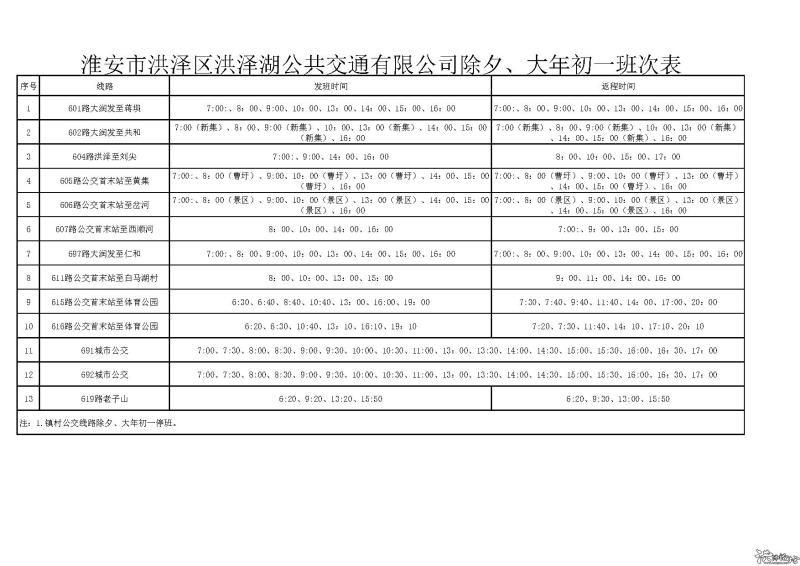 洪泽湖公交公司2026年春节除夕、大年初一公交班次表