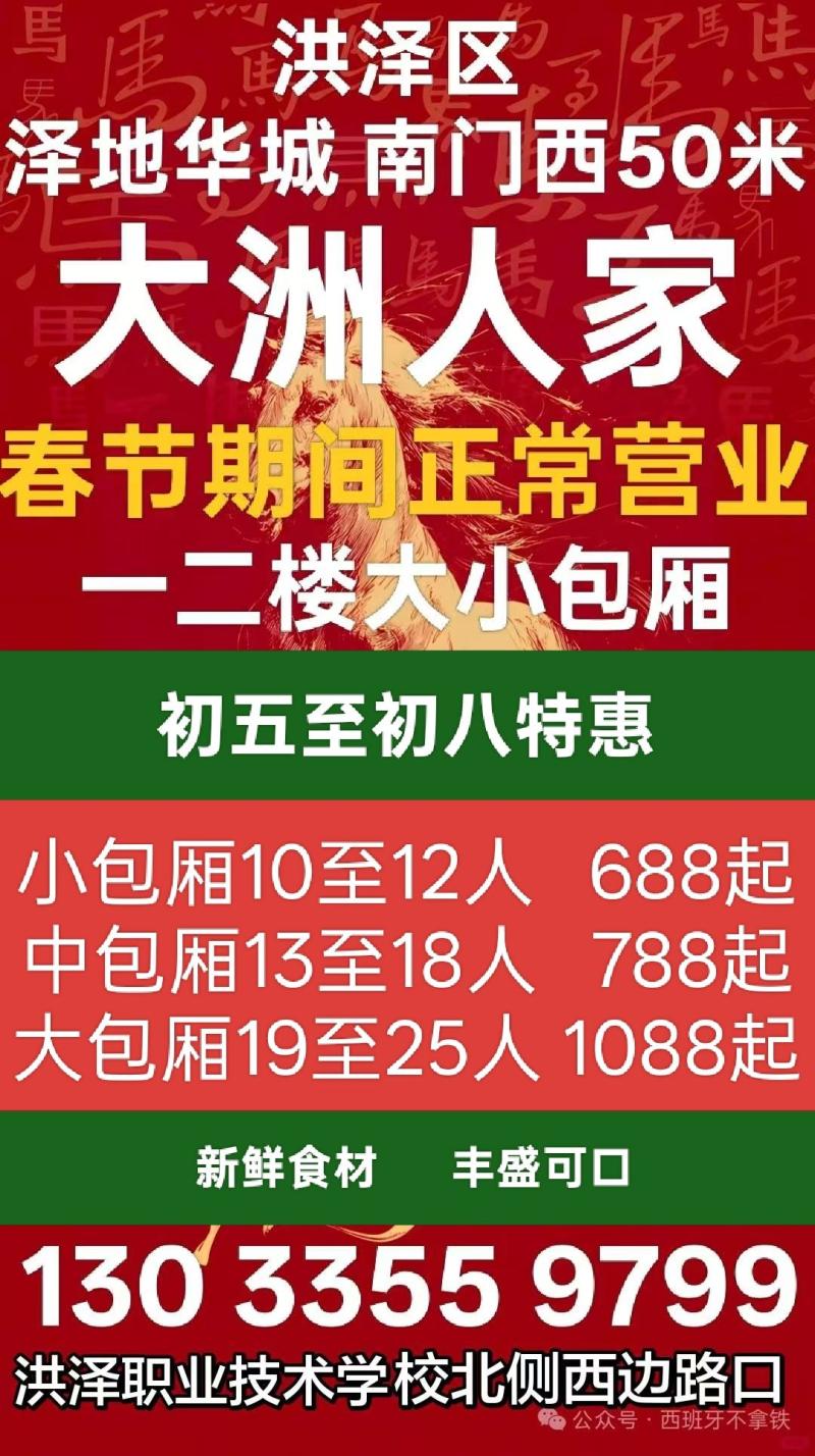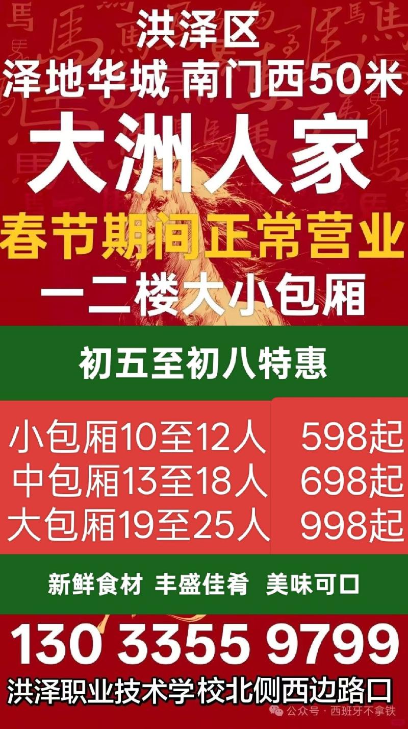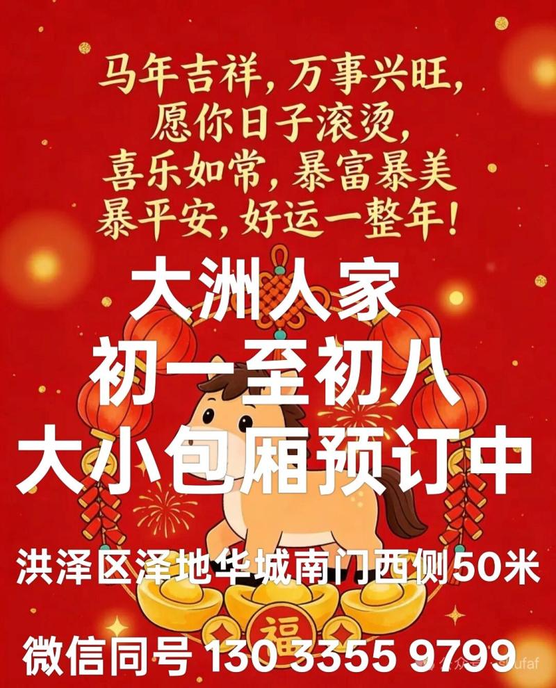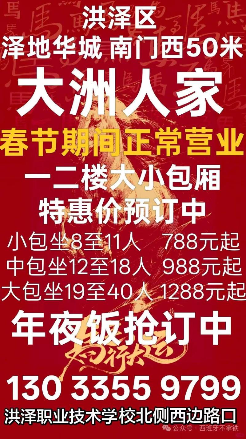 年聚餐来大洲人家,大中小包厢预订中!10至12人一桌788起。春节正常营业!