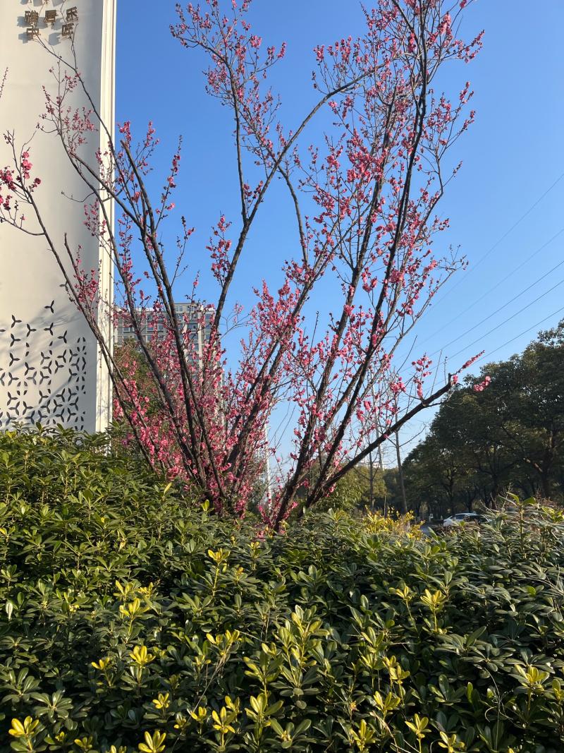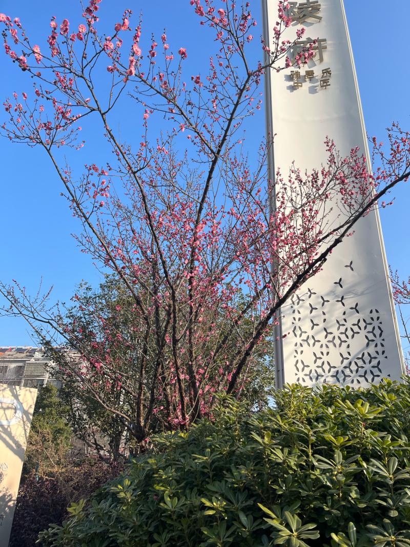 又到红梅绽放时,步行种植梅树地。