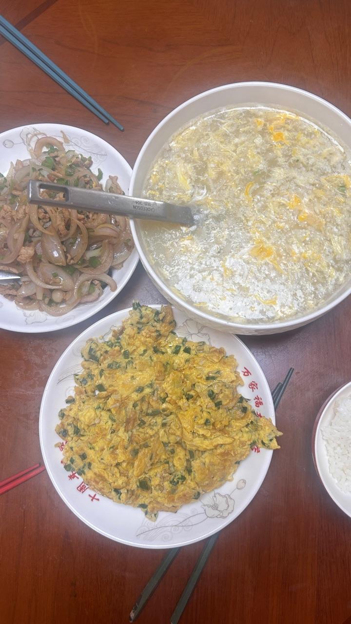 年过过了,饭菜偏清淡些!山药汤,洋葱肉丝,金针菇煎蛋