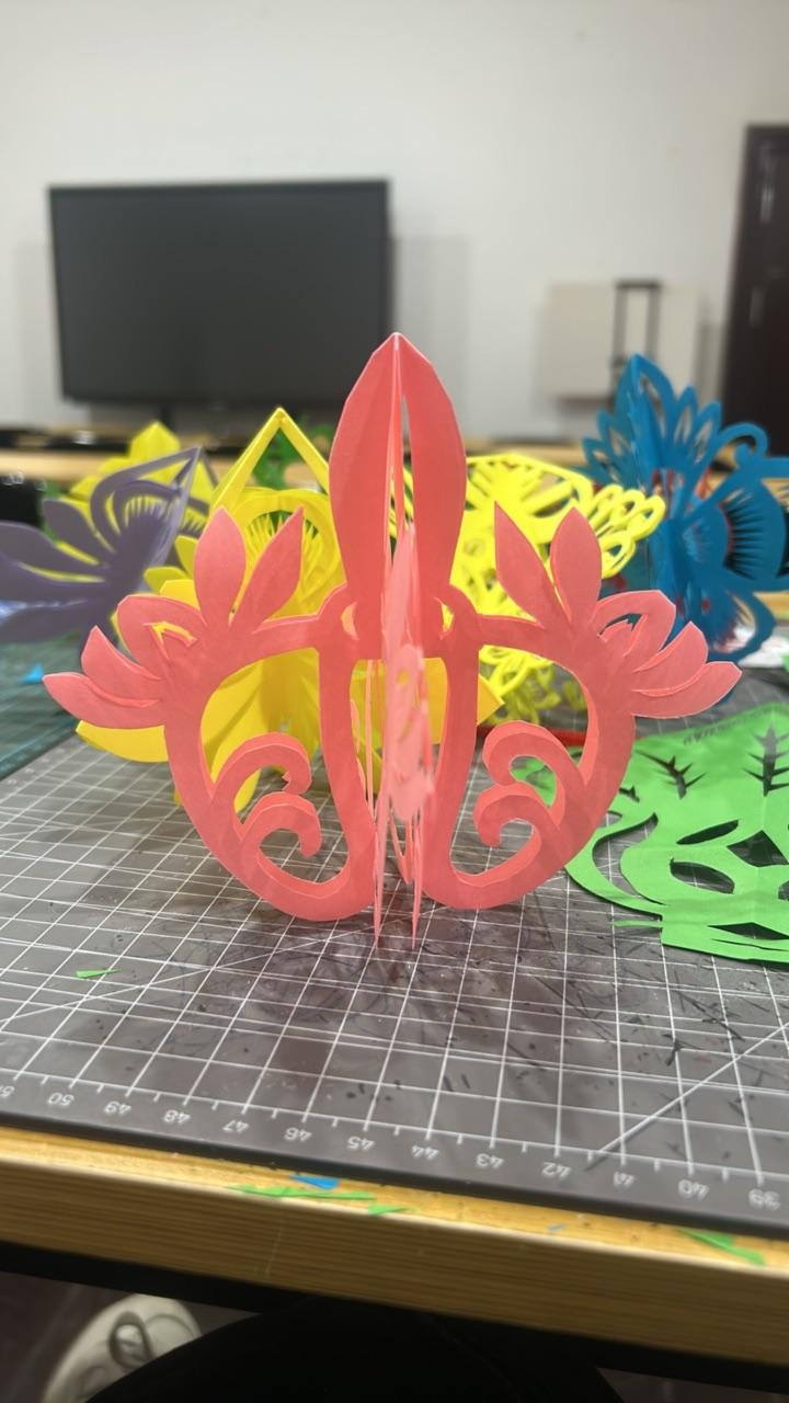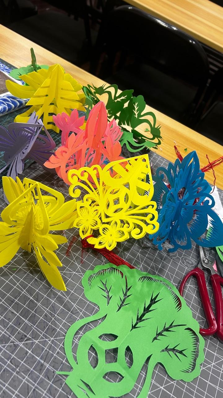 摆满了五颜六色的剪纸作品,色彩鲜亮,格外夺目。有精巧的立体挂件剪纸,层次丰富,灵动别致;有剪刀翻飞剪出的朵朵繁花,线条细腻,栩栩如生;还有清雅的莲花、立体的春字、翩跹的蝶恋花,每一件都独具匠心。这些作品由各色彩纸精心剪裁、拼接而成,汇聚在一起,便是一片五彩斑斓的剪纸世界。红的热烈、粉的娇嫩、绿的清新、黄的明媚,仿佛把整个春天都剪进了纸间,花开满地,生机盎然,让人一眼就沉醉在这绚丽多姿的剪纸艺术之中。