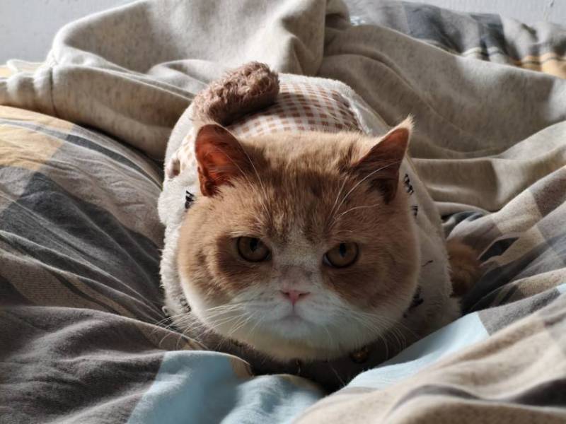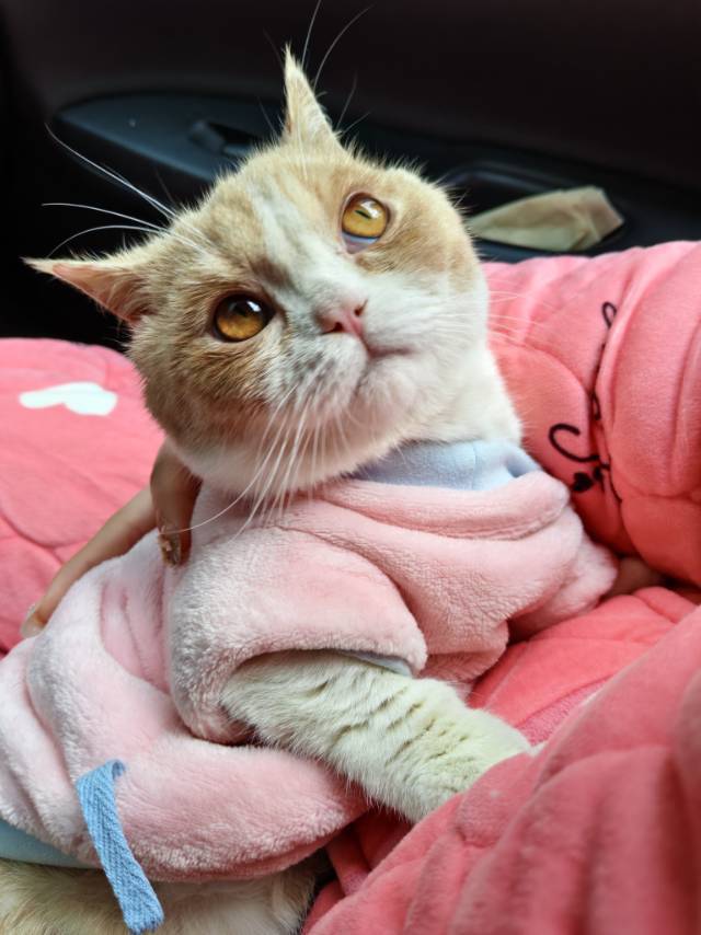 外貌:橘白英短,橘色毛发偏暖调,脸圆乎乎的,眼睛是琥珀色,粉鼻头粉爪垫,毛发蓬松柔软,看起来就像一块糯叽叽的小年糕。