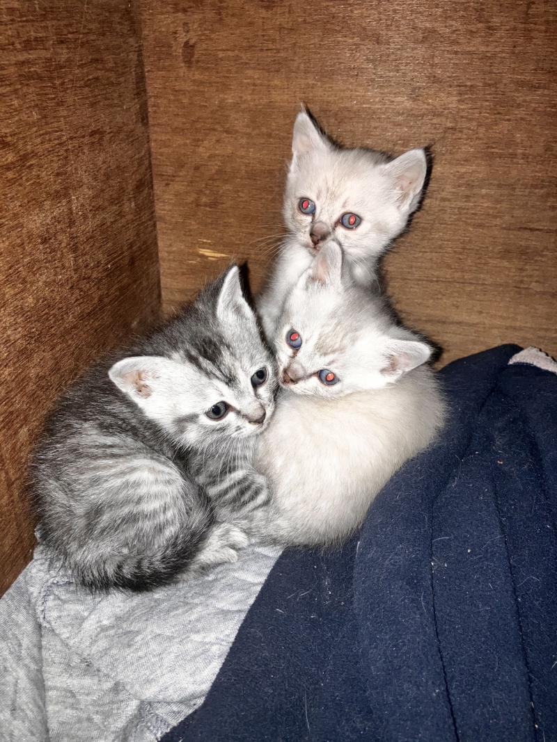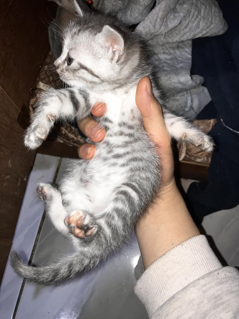 美短和流浪猫生的,白色是有点发灰,耳朵四肢尾巴都是有花纹的不是全白,三只都是母的,想养的来可以吃猫粮了