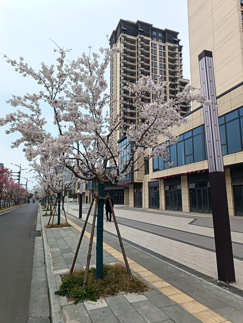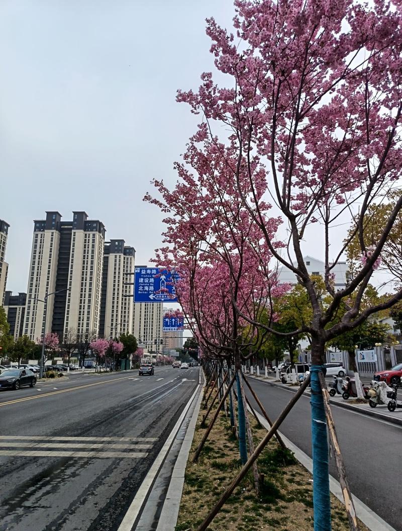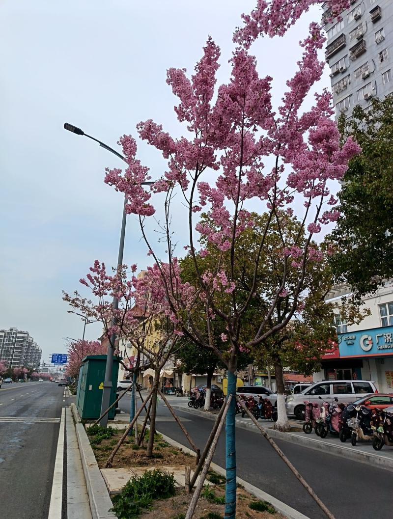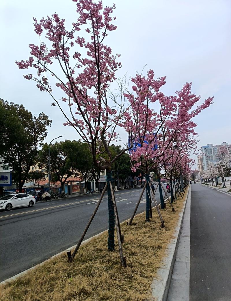 在洪泽人民路改造提升后,沥青路面两边路牙花池里,新栽种的树花开绽放迎春,夺人眼球。