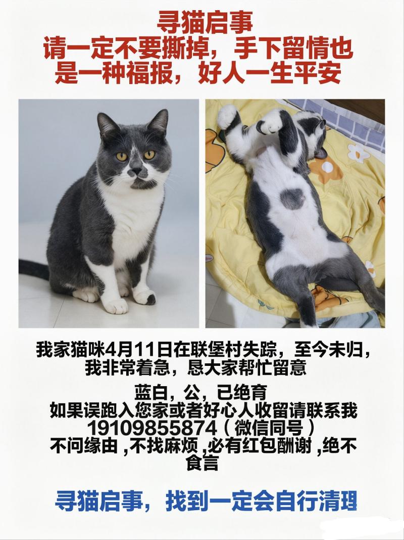 寻猫失踪的蓝白求好心人关注